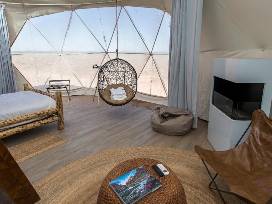 The room is 760 sq. ft. with 16.5 foot ceilings, with a large panoramic view window, A/C, a private modern bathroom with a rain shower, and wifi. It's an authentic glamping experience that offers luxe private domes in a stunningly beautiful mountain range.