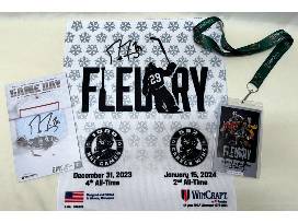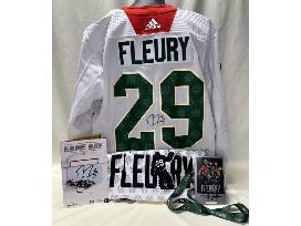 Celebrate our favorite Flower with these items from the Minnesota Wild's celebration of Marc-Andre Fleury's 552nd win and 1000th NHL game played. Package includes a NEW, UNWORN replica version of the Fleury jerseys designed by the MN Wild to be worn during warm ups for the game on February 9, 2024 vs the Pittsburgh Penguins, one Fleury rally towel, a commemorative game ticket, and game program from the game. All items, excluding the rally towel, are signed by #29 Marc-Andre Fleury. Certificates of authenticity available upon request.