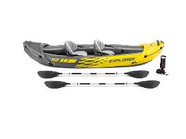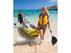 The Intex Explorer K2 Kayak is sporty and fun with a streamlined design for easy paddling. The bright yellow color and sporty graphics makes the kayak highly visible in the water. Great for experiencing lakes and mild rivers with a friend, this Sports Series kayak is perfect for two adults. Lightweight and compact, this kayak is a snap to assemble, and allows you to take the fun of kayaking wherever you go. Made with rugged vinyl construction, this sturdy kayak has an inflatable I-beam floor for comfort and rigidity. A removable skeg provides directional stability, while two adjustable, inflatable seats with backrests are included for comfort. Quick inflating or deflating is a breeze with a Boston valve on each side. A grab line and grab handle at each end is provided for your convenience, as well as a U.S. Coast Guard I.D., and a repair patch kit. The Explorer K2 Kayak provides added accessories including: two 86in aluminum oars and an Intex high-output pump for easy inflation and deflation.