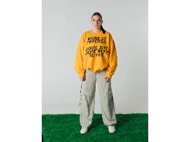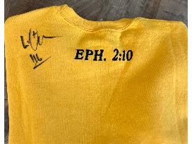 This heavy blend golden crewneck is made of a 50/50 poly-cotton blend and features the phrase above screen-printed with texture on the front and back of neck, in addition to the following: