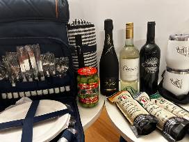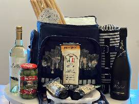 Picnic Bag with Blanket, 4 plastic wine glasses, silverware, plates and more