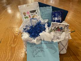 The Family Time Memories basket includes a 30-minute mini photo session plus a scrapbook styles photo album, stickers, markers, a frame, and a decorative bin.