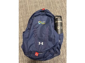 - An Under Armour Navy Backpack with Curing Kids Cancer embroidered logo, featuring a 15-inch laptop holder and shoe and laundry pocket.
