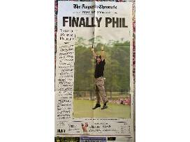 Double-sided Augusta Chronicle collectors poster featuring 1997 Tiger Woods and 2004 Phil Mickelson.