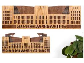 Show your Cleveland pride with this unique, vintage Municipal Stadium wall hanging! It was vast and windy, and part of the field was inevitably blocked by a pillar, but Cleveland fans loved the Lady by the Lake! Muni Stadium is recreated from intricately laser cut and layered walnut and cherry hardwood for a richly refined look. This is the perfect gift for Cleveland sports fans looking to add some nostalgia and a sophisticated touch to their home, bar, office, or man cave! It will also pair nicely with our laser cut Richfield Coliseum. Each expertly crafted wall hanging will enhance their home decor for years to come!