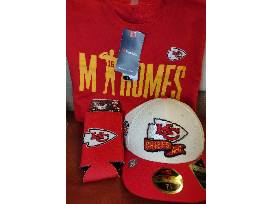 Show your Chiefs spirit with this package, including a Chiefs AFC Championship baseball hat (size 7.5), two-sided slim can koozie, a Mahomes t-shirt (size L), a Chiefs gray lanyard, a Kansas City Chiefs 3D wall art piece, and a WinCraft Kansas City Chiefs Premium Pennant.
