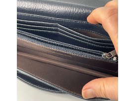 cut out flap for handle, zippered compartment and 6 card holder slots
