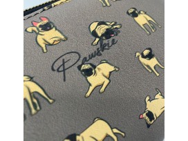 Vegan leather with cute pug pattern. Zipper closure with multiple interior pockets