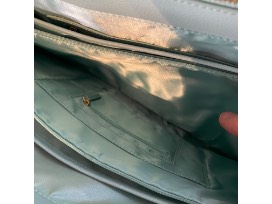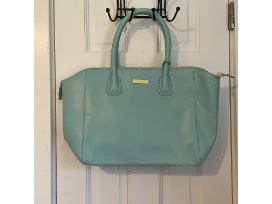 Pretty Robin's egg blue with multiple compartments. Large bag with satin interior