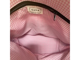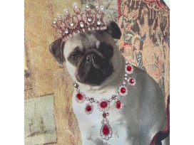 Precious pug sits atop a Victorian chair with jewel embellished crown and necklace on front. Lined in pretty pink gingham.