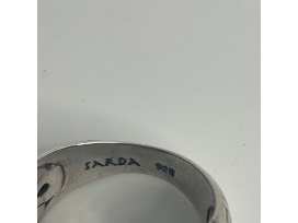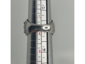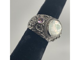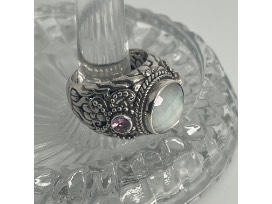 Appears to be white moonstone with amethyst accent stones. Filigree setting.