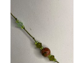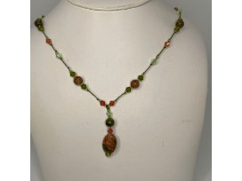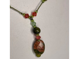 Unakite and Crystal hand knotted necklace on green cotton string.