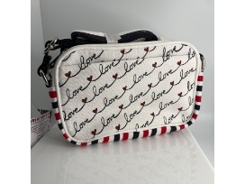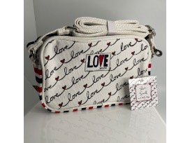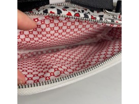canvas loves roll pattern with contrasting lining. 2 of zippered compartments and slide pocket on back
