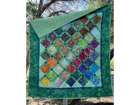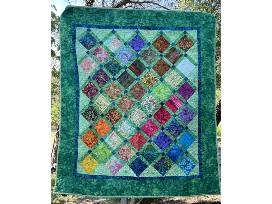 The Colorful Squares quilt features a vibrant array of squares in bold, lively colors set against a serene green background. The striking contrast highlights the playful, geometric design, creating a dynamic and eye-catching piece.