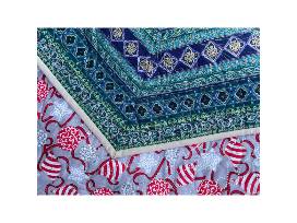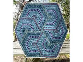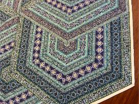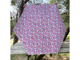 This Royal Purple and Teal Triangle Frenzy Hexagon Table Topper is sure to add a touch of royalty to your table. It measures 45.5" x 39.5" and reverses to a red, silver, white metallic Christmas fabric.