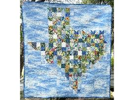 A stunning design where vibrant Texas wildflowers are intricately arranged in the shape of the state of Texas. The quilt beautifully captures the essence of Texas's natural beauty with an array of colorful blooms, highlighting the region's floral diversity. This unique and eye-catching quilt adds a touch of regional pride and nature-inspired charm to any space.