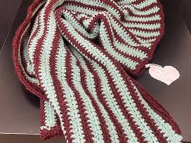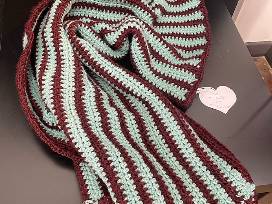 Get your hands on this lovingly knit striped maroon and teal throw blanket hand made by our beloved Senora Vargas.