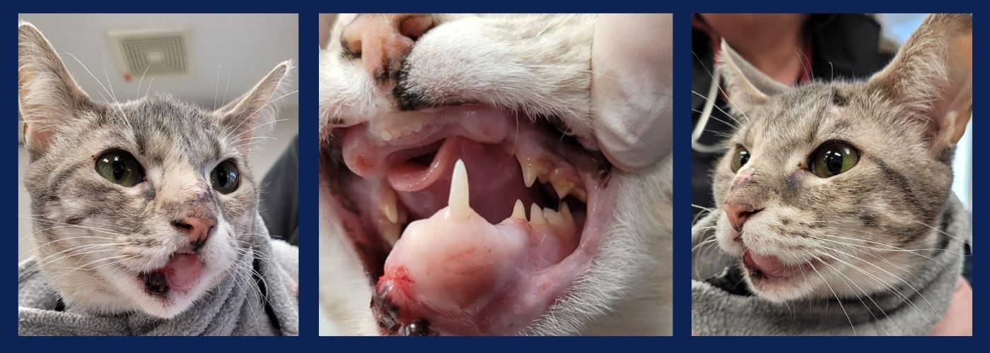 Once a cherished kitten, Cloe's journey has taken a heartbreaking turn. Scarred and in pain, she returned to us, her tiny body bearing the marks of previous trauma. Despite her struggles, Cloe's spirit remains unbroken. Her gentle nudges and affectionate gestures toward our team speak volumes of her resilient soul. But beneath her loving demeanor lies a world of suffering. Cloe's disfigured face tells a story of pain and hardship, with a lip avulsion leaving her in constant discomfort. Despite multiple surgeries, her wounds persist, trapping her in a cycle of pain and uncertainty.
