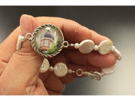 8 inch bracelet features the clocktower under glass. Surrounded by eight freshwater "coin" shaped pearls that measure 12mm each. It has a lobster claw closure.