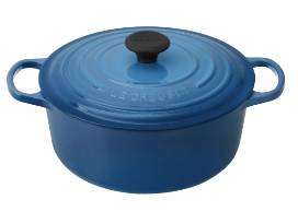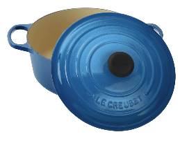 The Round Dutch Oven features colorful, long-lasting exterior enamel that resists chipping and cracking; interior enamel is engineered to resist staining and dulling. The sand-colored interior enamel makes it easy to monitor food as it cooks, preventing burning and sticking. Oversized handles provide even weight distribution and a secure grip. Ergonomic composite knobs are heat resistant to 500 degrees F. Built-in lid stabilizers provide a secure, no-slide fit. Made from cast iron and manufactured in France. Dishwasher safe.