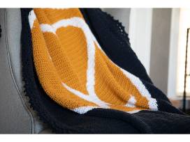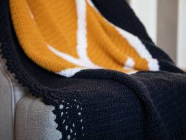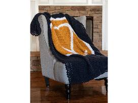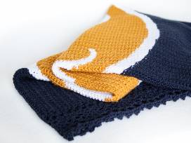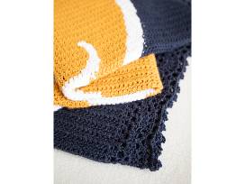 This handmade Sacred Selections blanket is masterfully crocheted in navy, gold, and white. It measures 62x56 inches.