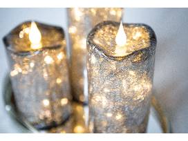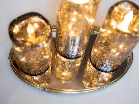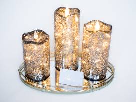 This elegant, timeless piece features a vintage gold-toned, metal-framed, mirrored tray. Its edging is detailed with a simple design and would be beautiful with many home decor styles. Also included are three crackle glass flameless candles that will add sparkle and glamour to any room!