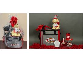 This premium Gift Basket from Raising Cane's contains a collection of branded must-haves including: (1) One insulated cooler, (2) two cozies, (1) one plush animal toy, (2) two Shirts, assorted Gift Cards and much more! FMV: $100.-