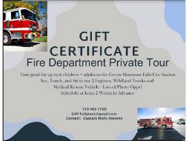 Visit good for up to 4 children plus adults to the Green Mountain Falls Fire Station. See, Touch, and Sit in our 2 Engines, Wildland Trucks, and Medical Rescue Vehicle- Lots of photo ops! Schedule at least one week in advance. FMV $150.