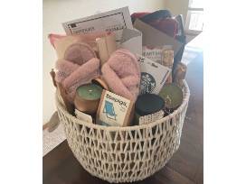 Blanket, 60 minute massage, body scrubs, body butter, loofah, slippers, goat milk soaps, champagne, $25 Starbucks gift card, teas with 2 mugs, handmade candles, $25 gift certificate to Heartshake studios, FMV $200.