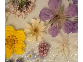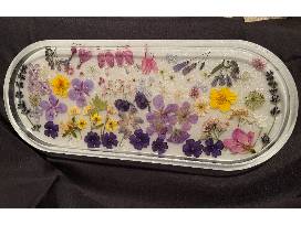 Hand picked and hand pressed flowers in a resin tray. Made by Shari Moser of Glacier Blue Creations