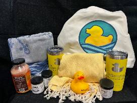 Gift Basket with 2 Towels, Several Spazazz Scents, 2 Logo Travel Mugs, $20 Duck Bucks, Ducky Tote