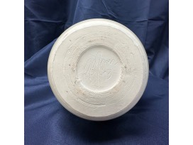 1A Seneca pottery vase made by Peter B. Jones, a renowned potter and sculptor, who resides on the Allegany Territory of the Seneca Nation of Indians. Peter is native Onondaga - Seneca, Beaver Clan from New York State. This pottery piece was made in 1993. It is wheel thrown and kiln fired with a floral design typically used in Onondaga beadwork. On the bottom it is signed and dated P B Jones '93. Approximately 6 /34" W at the top and 8 1/2'' H.