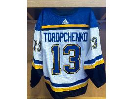Bid on #13 Alexey Toropchenko's game-worn set 1 road jersey from the 2023-24 season. This jersey was worn during select road games played in between the dates 9/23/23 and 11/28/23. This jersey will come with a sheet featuring the exact games this jersey was worn in.