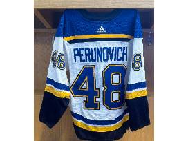 Bid on #48 Scott Perunovich's game-worn set 1 road jersey from the 2023-24 season. This jersey was worn during select road games played in between the dates 9/23/23 and 11/28/23. This jersey will come with a sheet featuring the exact games this jersey was worn in.