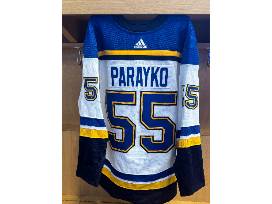 Bid on #55 Colton Parayko's game-worn set 1 road jersey from the 2023-24 season. This jersey was worn during select road games played in between the dates 9/23/23 and 11/28/23. This jersey will come with a sheet featuring the exact games this jersey was worn in.