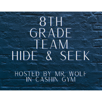 Who will win? Mr. Wolf is saying farewell to the 8th grade class by hosting a Team Hide & Seek Night in Cashin Gym from 6-8pm on Saturday, May 3rd. This fun night also includes music, pizza & drinks!