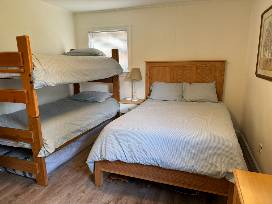 The beach house has four bedrooms and three full baths. The master bedroom has a queen size bed and a private bathroom with a shower. The second and third bedrooms have two twin beds each. The twin beds can be arranged together or separated easily. The fourth bedroom has one full bed and a twin bunk bed set. All beds have pillows and comforters, but you are required to bring your own bed linens (sheets and pillow cases) and bath towels.