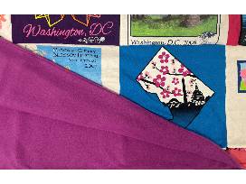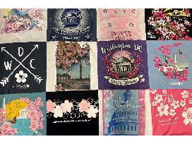 Own a unique piece of National Cherry Blossom Festival history! This handmade quilt showcases the history of the Festival through our beloved t-shirts. Measures approximately 58" by 70" with a purple fleece background.