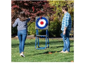 The wide bases allow for play on a variety of surfaces, from the sandy beach to the grassy park, to the tailgate tarmac, this outdoor game is ready for anything! Fun for all ages and skill sets - constructed out of plastic and foam and are specifically designed to stick in the unique bristle target. Target features storage slots to keep all the components together when not in use. Standing over 5 feet tall, this heavy-duty axe target with a 1.5-inch thick steel frame can handle your best shot! This axe target is made up of hundreds of 2-inch plastic bristles and is specifically designed to safely catch our axes throw after throw.