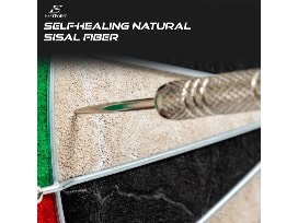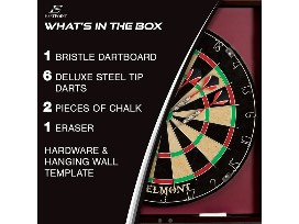 Whether you're looking to play professional darts or just-for-fun, you can enhance your skills with this 18-inch bristle dartboard and cabinet-an ideal dart set for leagues, tournaments, and casual play. Complete with (2) chalk dart scoreboards, built-in dart holders for up to 6 darts, (6) deluxe steel tip darts and hanging hardware. The Belmont dartboard is made of high-density, sisal fiber that naturally heals itself, ensuring long-lasting durability for shot after shot without visible holes. Complete with a heavy-duty steel spider frame for durability.