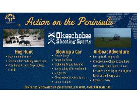 Get ready for action and lots of fun. We're combining the popular Blow up a Car, where you will spend the day on a private range at Okeechobee Shooting Sports shooting an array of guns and targets - including a car! Includes target car shoot with machine guns and Barrett 50 caliber. Includes exploding targets, ammo, and range safety officer. Winners are welcome to stay and shoot their own private firearms as well. The range offers clay, pistol and rifle. Includes six to eight people! Lunch is included. Also included is a hog hunt for one at Antlered Acres Ranch in Okeechobee, Florida. To be scheduled on a mutually agreed upon date. Finally, enjoy an airboat adventure for up to three adults on Lake Okeechobee, Lake Istokpoga, Blue Cypress Lake, Kissimmee River, Upper Saint Johns River, or the Everglades. Tour, bird/alligator watching, fishing, frogging, hunting, or just ride and bring a picnic. Expires 3/1/26