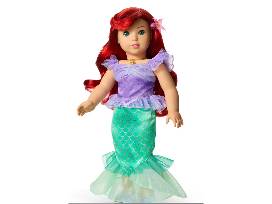 An 18" Ariel doll with aqua-colored eyes that open and close, and signature red wavy hair styled with sideswept bangs and a pink sea-flower hair clip with a yellow rhinestone center.