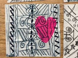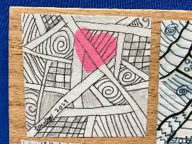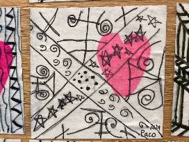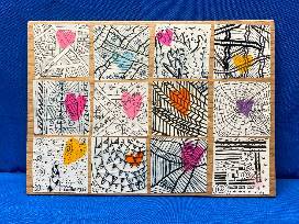 12 individual black and white pieces with bright accent hearts.