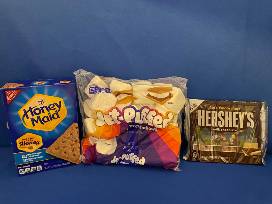 - All the ingredients to make S'mores-6 Hershey chocolate bars, a huge bag of marshmallows and a box of graham crackers.