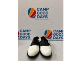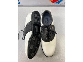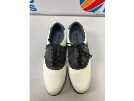 FootJoy is known for their high-quality golf shoes. This pair of spikeless, softjoy shoes are white and navy blue. They are a size 9.5M.