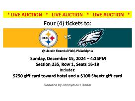 - Four (4) tickets to the Pittsburgh Steelers vs. Philadelphia Eagles game at Lincoln Financial Field (Philly) on Sunday, 12/15/2024 @ 4:25. Section 235, Row 1, Seats 16, 17, 18 and 19.