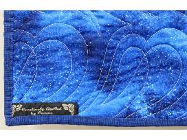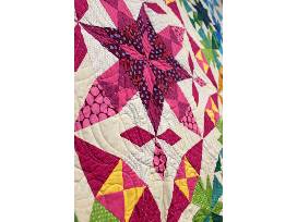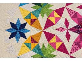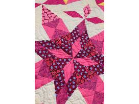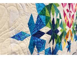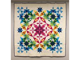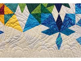 This Alaska Rainbow quilt is a template-pieced pattern by Laundry Basket Quilts. The back of the quilt is a nod to the Alaska State Flag with its deep blue background and stars.