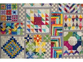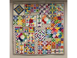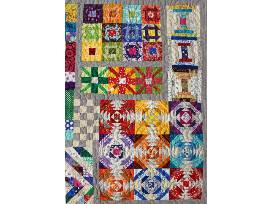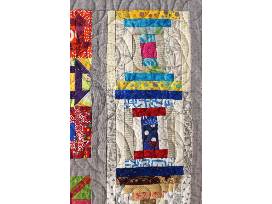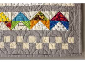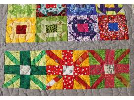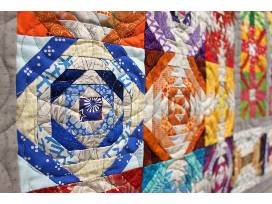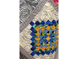 This colorful quilt top is made from a Jen Kingwell pattern called Long Time Gone. It was pieced by traditional rotary cutting, templates, and Foundation paper piecing. The monochromatic back is the Onion Ring pattern by Kaffe Fassett.