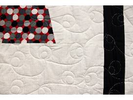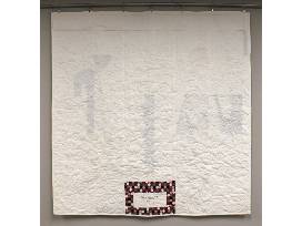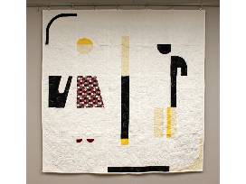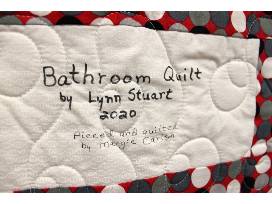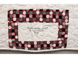 I designed this quilt to hang in a bathroom. I began laying a grid over the traditional US bathroom symbols, then removing/playing with different bits to create a final design. The more I removed, the more I liked how deconstructing the female/male forms communicates the dysfunction inherent in the strict binary presentation of gender.