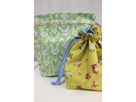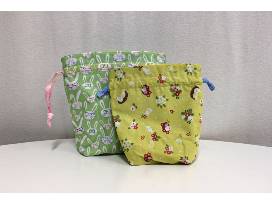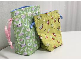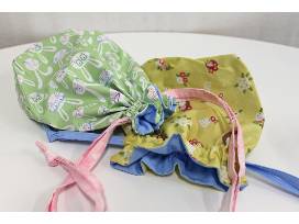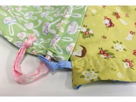 Reusable fabric drawstring bags made with spring fabrics. The smaller bag has coral drawstrings